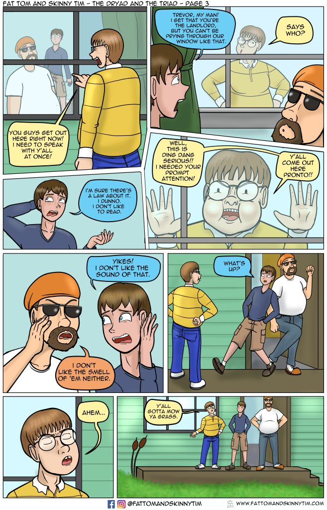 It has finally begun! Page 1 of the new story arc is here and a new character is introduced. This is Trevor, Tom and Tim’s landlord, and he has expectations.